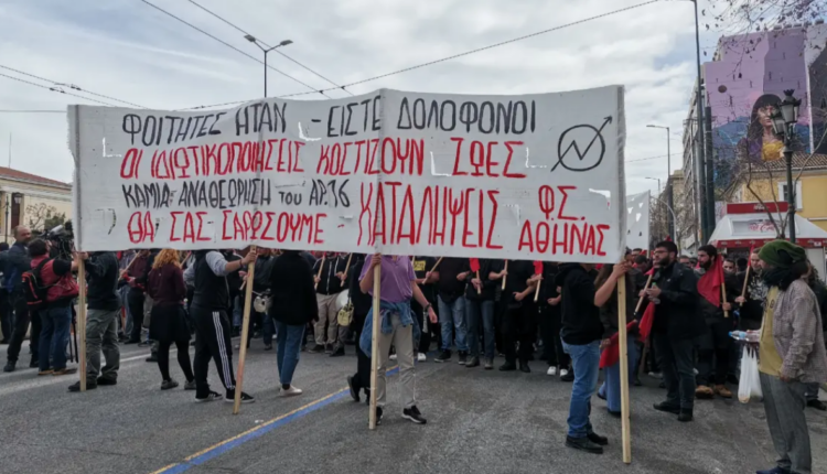 Φοιτητικοί σύλλογοι βγαίνουν στους δρόμους και διαμαρτύρονται για την τραγωδία στα Τέμπη που είχε ως αποτέλεσμα 57 άνθρωποι να χάσουν την ζωή τους. “Το έγκλημα αυτό δεν θα συγκαλυφθει όλων των νεκρών θα γίνουμε φωνή” είναι το κύριο σύνθημα των φοιτητών.
