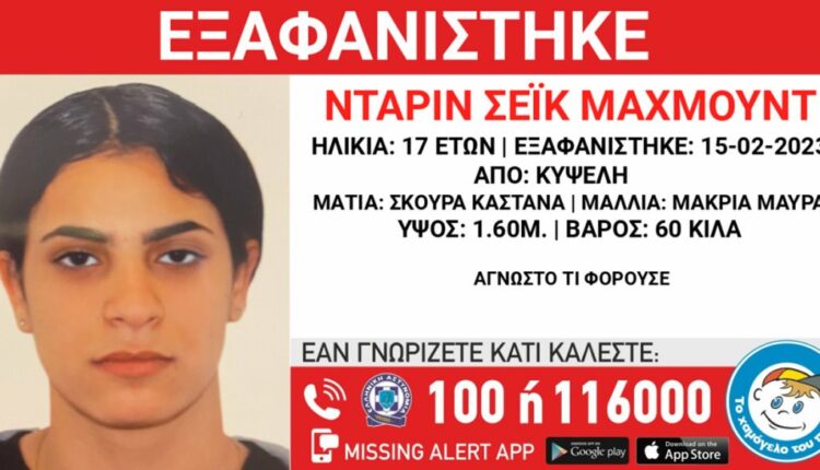 Εξαφανίστηκε το μεσημέρι της Τετάρτης 15 Φεβρουαρίου από την περιοχή της Κυψέλης, η 17χρονη Νταρίν Σεϊκ Μαχμούντ, η οποία κατάγεται από τη Συρία, σύμφωνα με την ενημέρωση από το «Χαμόγελο του Παιδιού».
