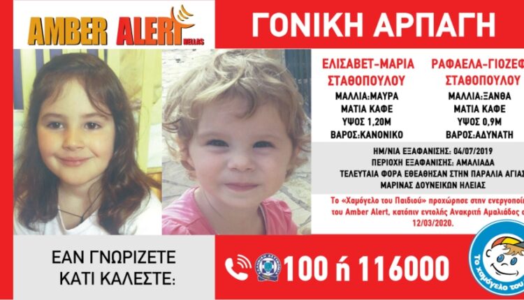 Το «Χαμόγελο» προχώρησε στην ενεργοποίηση του Amber Alert σήμερα 13 Μαρτίου, κατόπιν της από 12/3/2020 εντολής Ανακριτή Αμαλιάδας. Η Ελισάβετ-Μαρία έχει ύψος 1.20 μ., έχει κανονικό βάρος, έχει μαύρα μαλλιά και καφέ μάτια. Η Ραφαέλα-Γιοζεφίν έχει ύψος 0.90 μ., είναι αδύνατη, έχει ξανθά μαλλιά και καφέ μάτια.