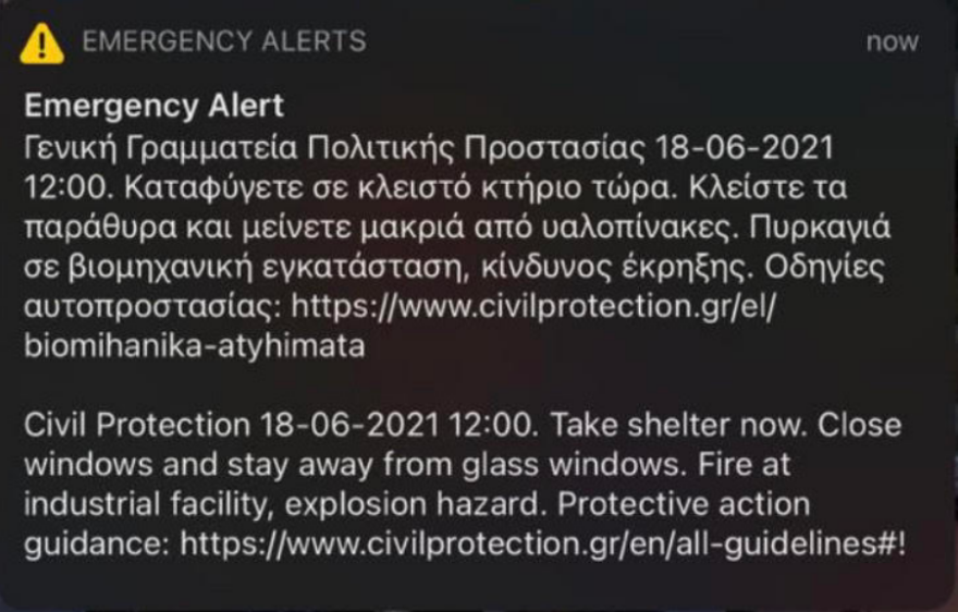 Μάλιστα στάλθηκε στους πολίτες μήνυμα από το 112. Το μήνυμα λέει στους πολίτες: «Καταφύγετε σε κλειστό κτήριο τώρα. Κλείστε τα παράθυρα και μείνετε μακριά από υαλοπίνακες. Πυρκαγιά σε βιομηχανική εγκατάσταση,κίνδυνος έκρηξης».