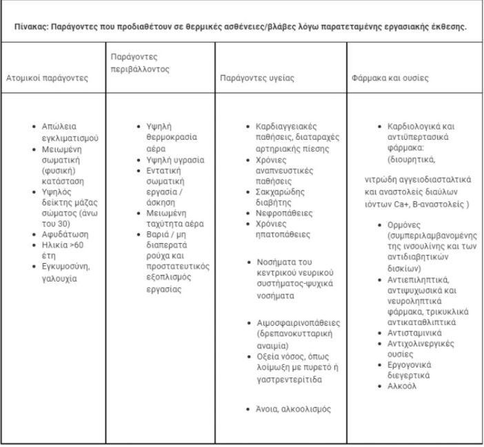 Παράλληλα, το Σώμα Επιθεώρησης Εργασίας εντατικοποιεί την περίοδο αυτή τους στοχευμένους ελέγχους σε εργασιακούς χώρους, σύμφωνα με την επισυναπτόμενη υπ’ αριθμ. 56738/30.07.2021 εγκύκλιο, και σε συνέχεια της από 22 Ιουνίου 2021 σχετικής εγκυκλίου (αριθ.πρωτ. 41935), με έμφαση σε υπαίθριες εργασίες (π.χ. οικοδομές, οδικά και άλλα τεχνικά έργα), σε εργασίες σε στεγασμένους χώρους όπου λόγω της φύσης των παραγωγικών διαδικασιών μπορεί να υπάρχει επί πλέον θερμική καταπόνηση από υψηλές τιμές θερμοκρασίας-υγρασίας και ακτινοβολούμενη θερμότητα (π.χ. σε χυτήρια, μεταλλουργίες, βιομηχανίες πλαστικών, μαγειρεία κ.α.), καθώς και σε χειρωνακτικές εργασίες (π.χ. μεταφορά βαρέων αντικειμένων, οικοδομικών υλικών). Σε κάθε περίπτωση, εφιστάται η προσοχή για εργαζόμενους που ανήκουν σε ομάδες υψηλού κινδύνου (πίνακας).