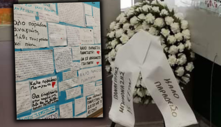 Οι μαθητές του 1ου Γυμνασίου Ελευθερίου Κορδελιού επέλεξαν έναν συγκινητικό τρόπο προκειμένου να πουν το τελευταίο αντίο στον φίλο και συμμαθητή τους. Στην είσοδο του σχολείου τους άναψαν κεριά και άφησαν λουλούδια και ένα στεφάνι, ενώ σε έναν τοίχο τοποθέτησαν σημειώματα στη μνήμη του. Παράλληλα έφτιαξαν και ένα πανό το οποίο γράφει «Παναγιώτη για πάντα μαζί μας 1/3/2023» και τήρησαν ενός λεπτού σιγή στη μνήμη του.