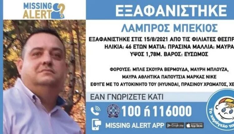 Νεκρός βρέθηκε ο 46χρονος Λάμπρος Μπέκιος, τα ίχνη του οποίου χάθηκαν τον Δεκαπενταύγουστο, από την περιοχή Φιλιάτες Θεσπρωτίας.