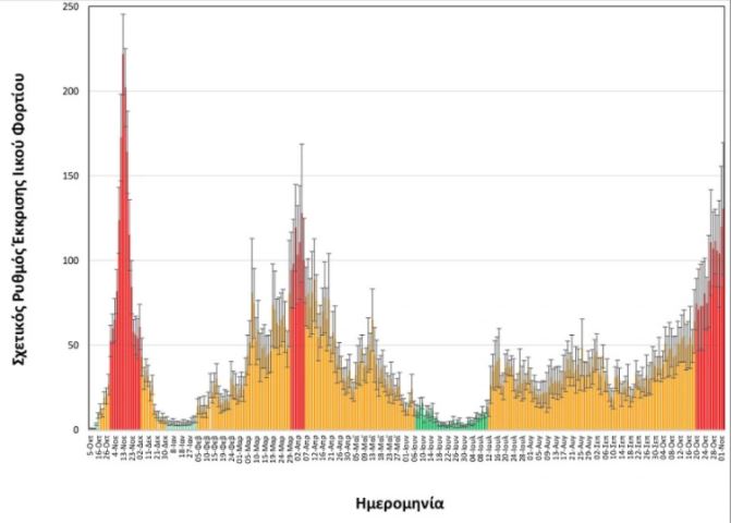 Όπως φαίνεται στα διαγράμματα που παρουσιάζει το ΑΠΕ-ΜΠΕ οι τιμές που καταγράφηκαν τις τελευταίες ημέρες είναι αντίστοιχες των μεγίστων τιμών που καταγράφηκαν τον Απρίλιο του 2021, στο τρίτο κύμα της πανδημίας.