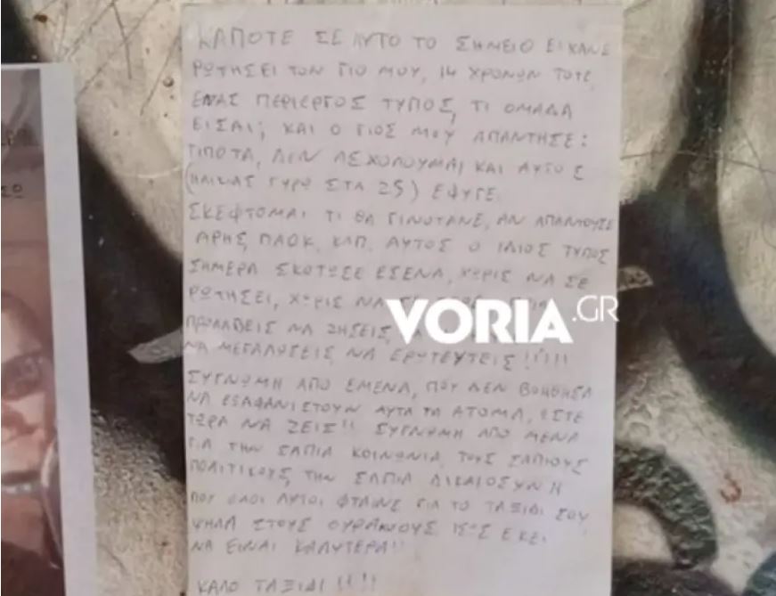 Ανατριχιαστικό είναι το σημείωμα που άφησε μια μητέρα στο σημείο όπου δολοφονήθηκε ο Άλκης Καμπανός στη Θεσσαλονίκη.