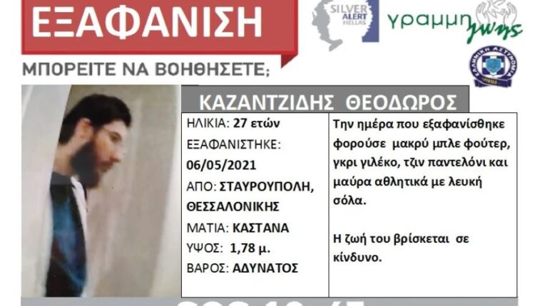 Ο Θεόδωρος Καζαντζίδης, 27 ετών, την 06/05/21 εξαφανίστηκε από το σπίτι του, στη Σταυρούπολη, Θεσσαλονίκης. Έχει καστανά μάτια, ύψος 1,78μ και είναι αδύνατος.