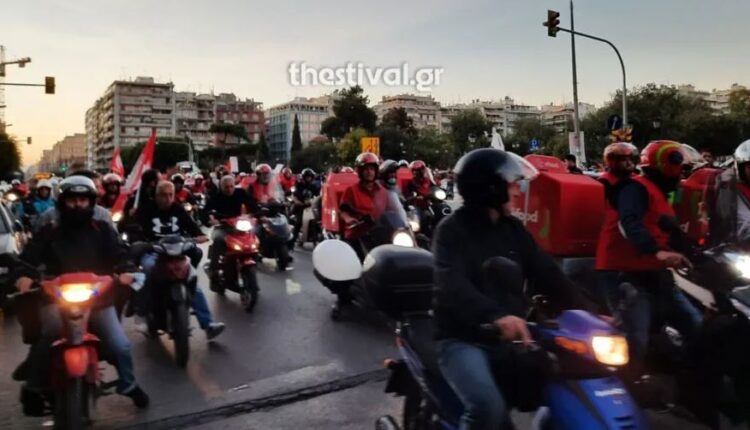 Στους δρόμους για ακόμη μία μέρα οι διανομείς της e-food κάνοντας μοτοπορεία από το άγαλμα Βενιζέλου έως τον Λευκό Πύργο με σύνθημα «σταθερή και μόνιμη δουλειά για όλους».