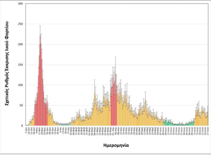 Συγκριτικά, στα δείγματα που λαμβάνονται καθημερινά στην είσοδο της Εγκατάστασης Επεξεργασίας Λυμάτων Θεσσαλονίκης, αναφορικά με τις εξορθολογισμένες τιμές σχετικής έκκρισης ιικού φορτίου, η μέση τιμή των δύο πιο πρόσφατων μετρήσεων, δηλαδή της Δευτέρας 26/07 και της Τρίτης 27/07 είναι: