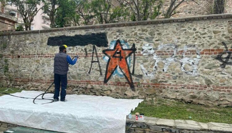 Συνθήματα έγραψαν άγνωστοι στο τείχος του Βυζαντινού Ιερού Ναού Αγίου Παντελεήμονα στο κέντρο της Θεσσαλονίκης. Το Σωματείο Φίλοι του Ιστορικού Κέντρου της Θεσσαλονίκης ανέλαβε την πρωτοβουλία και τη δαπάνη για τον καθαρισμό του.