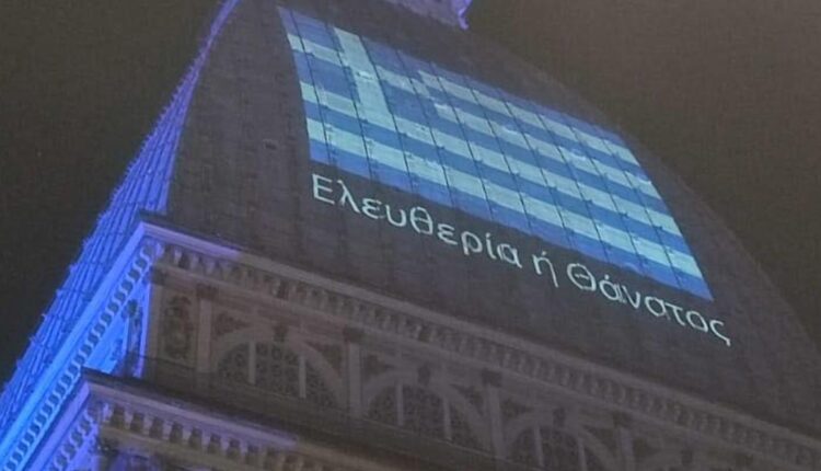 Το γνωστότερο μνημείο του Τορίνο, η Μόλε Αντονελιάνα, φωτίσθηκε χθες βράδυ με τη γαλανόλευκη σημαία και το σύνθημα «Ελευθερία ή θάνατος». Η πρωτοβουλία ανήκει στο επίτιμο προξενείο της χώρας μας στο Τορίνο, σε συνεργασία με το τμήμα πολιτισμού του δήμου και με τη χορηγία του ιταλοελληνικού οργανισμού για την εκπαίδευση, Microkosmos.