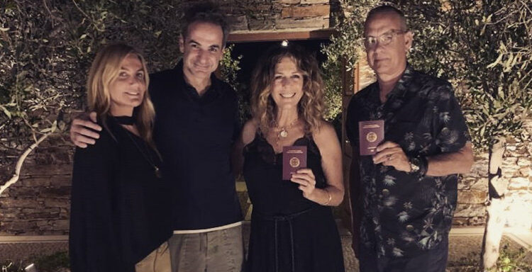 Ο Τομ Χανκς και η Ρίτα Γουίλσον βγήκαν χθες αναμνηστική φωτογραφία κρατώντας τα ελληνικά τους διαβατήρια, τα οποία μόλις παρέλαβαν, αφού ύστερα από πρωτοβουλία του Κυριάκου Μητσοτάκη έχουν πολιτογραφηθεί Έλληνες.