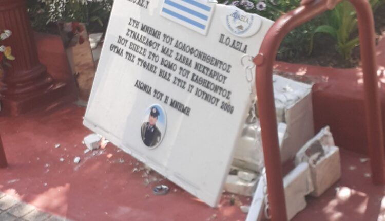 Δύο, μόλις, ημέρες μετά την επέτειο μνήμης του ήρωα και δολοφονηθέντα Αρχιφύλακα Νεκταρίου Σάββα και μετά την τελετή που πραγματοποιήθηκε εις μνήμη του, στην οποία έγινε και η αποκάλυψη της αναθηματικής επιγραφής στο σημείο όπου πριν από 12 χρόνια δολοφονήθηκε από τα πυρά τρομοκρατών της οργάνωσης “Σέχτα Επαναστατών”, το μνημείο βρέθηκε βανδαλισμένο και κατεστραμμένο.