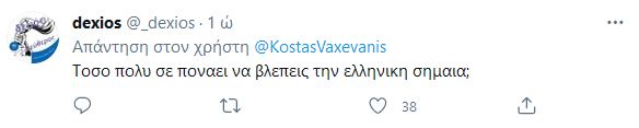 Έγραψε συγκεκριμένα στο twitter: Προσέξτε πού βάζετε τις σημαίες αυτές τις μέρες, γιατί μπορεί να υπάρχει από κάτω κανένας άνθρωπος που δεν έχει να φάει