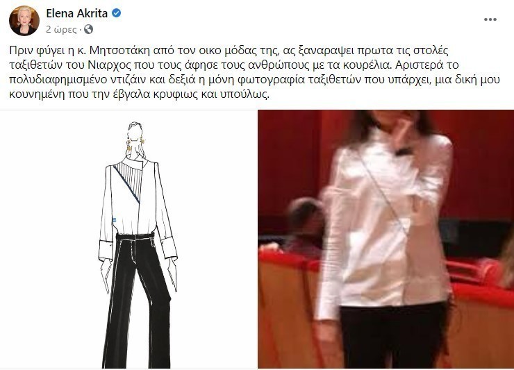 «Πριν φύγει η κ. Μητσοτάκη από τον οίκο μόδας της, ας ξαναράψει πρώτα τις στολές ταξιθετών του Νιάρχος που τους άφησε τους ανθρώπους με τα κουρέλια. Αριστερά το πολυδιαφημισμένο ντιζάιν και δεξιά η μόνη φωτογραφία ταξιθετών που υπάρχει, μια δική μου κουνημένη που την έβγαλα κρυφιως και υπούλως».