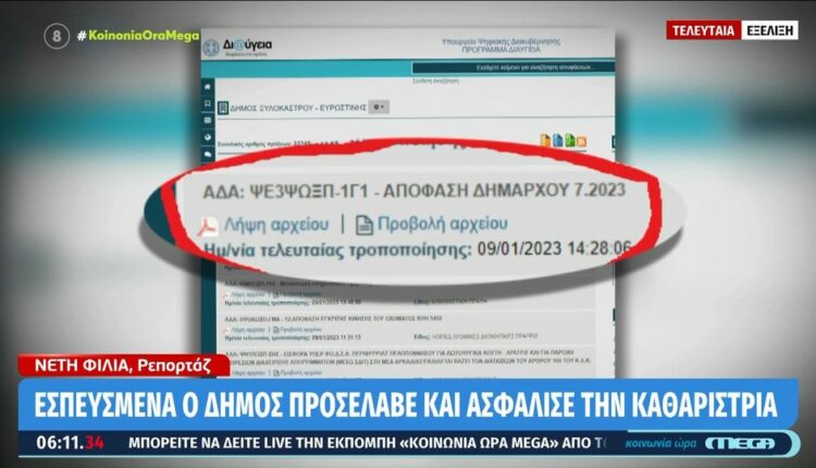 Ο Δήμος Ξυλοκάστρου εσπευσμένα προσέλαβε και ασφάλισε την 45χρονη καθαρίστρια μετά θάνατον, καθώς όπως φαίνεται στο σύστημα της ΔΙΑΥΓΕΙΑ, στις 9 Ιανουαρίου ο Δήμος ανήρτησε την πρόσληψη τεσσάρων υπαλλήλων καθαριότητας, ανάμεσα σε αυτούς και η άτυχη εργαζόμενη.
