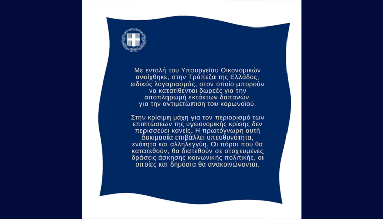 “Κατόπιν εντολής του Υπουργείου Οικονομικών, ανοίχθηκε χθες, 02/04/2020, στην Τράπεζα της Ελλάδος, ειδικός λογαριασμός, στον οποίο μπορούν να κατατίθενται δωρεές προς αποπληρωμή εκτάκτων δαπανών για την αντιμετώπιση του κορονοϊού (COVID-19).