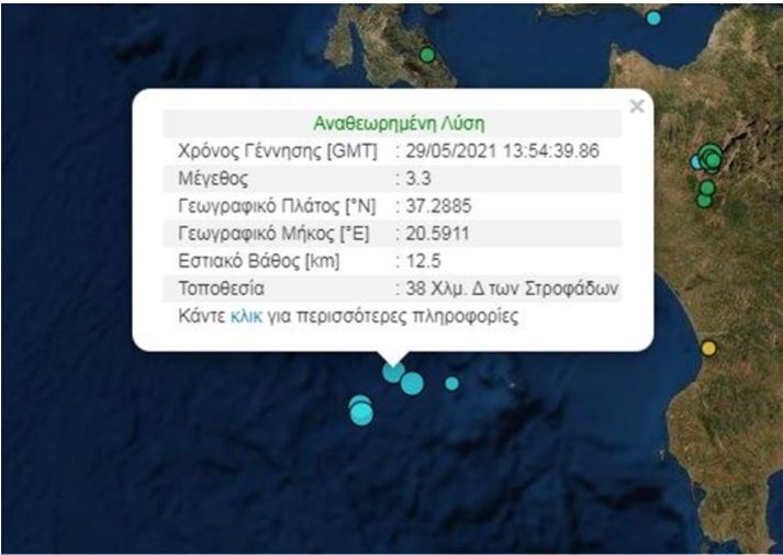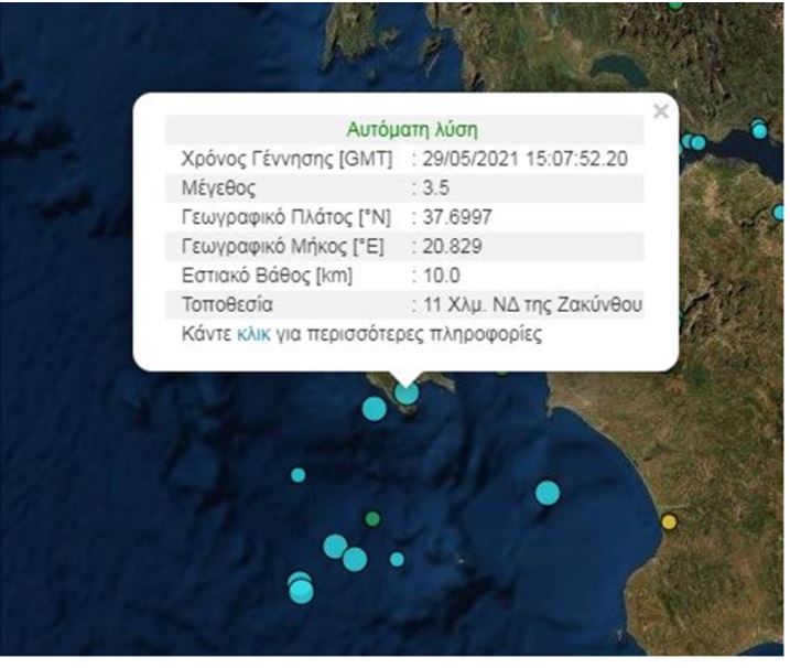Τρεις σεισμικές δονήσεις σημειώθηκαν σε διάστημα 20 λεπτών στη Ζάκυνθο. Σύμφωνα με το Γεωδυναμικό Ινστιτούτο η πρώτη σεισμική δόνηση ήταν 3,1 Ρίχτερ το εστιακό βάθος 3,7 χλμ, 32χλμ δυτικά των Σοφάδων. Η δεύτερη ήταν 3,3 Ρίχτερ με 12χλμ εστιακό βάθος, 38 χλμ δυτικά των Σοφάδων. Η τρίτη ήταν 3,5 Ρίχτερ, το εστιακό βάθος 10 χλμ, 11 χλμ νοτιοδυτικά της Ζακύνθου.