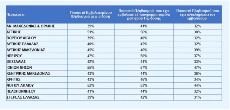 Τα επίσημα στοιχεία δείχνουν επίσης ότι στην Αττική το 51% του πληθυσμού έχει ήδη εμβολιαστεί με μία δόση, γεγονός ενθαρρυντικό.