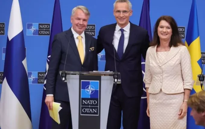 Η Φινλανδία και η Σουηδία πλέον θα έχουν το καθεστώς των χωρών που έχουν προσκληθεί από τη Συμμαχία και θα συμμετέχουν στις συζητήσεις του ΝΑΤΟ ανέφερε ο Γενικός Γραμματέας της Συμμαχίας Γενς Στόλτενμπεργκ στην κοινή συνέντευξη Τύπου που παραχώρησε με τον Φινλανδό Υπουργό Εξωτερικών Πέεκα Χααβίστο και την Σουηδή ομόλογό του Αν Λίντε μετά την υπογραφή των πρωτοκόλλων προσχώρησης.