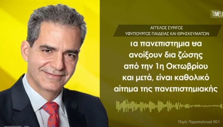 Από την 1η Οκτωβρίου τα μαθήματα στα πανεπιστήμια θα είναι δια ζώσης σημειώνοντας πως στα αμφιθέατρα θα είναι οι εμβολιασμένοι φοιτητές και όσοι έχουν νοσήσει. δήλωσε στα Παραπολιτικά 90,1 και στην εκπομπή «Μπρα ντε φερ» με τους δημοσιογράφους Δημήτρη Τάκη και Χριστίνα Κοραή, ο υφυπουργός Παιδείας Άγγελος Συρίγος.