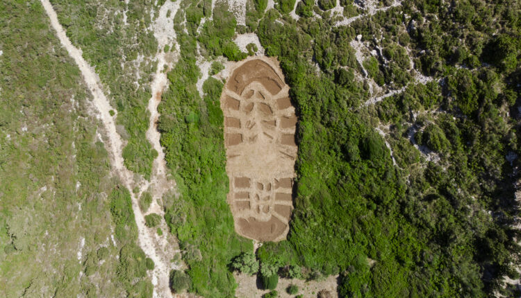 Ο καλλιτέχνης χρησιμοποίησε ένα τεράστιο κομμάτι γης σαν καμβά και δούλεψε για 15 μέρες σιωπηλά το ηχηρό μήνυμά του που “ταρακούνησε” ολόκληρο το νησί.