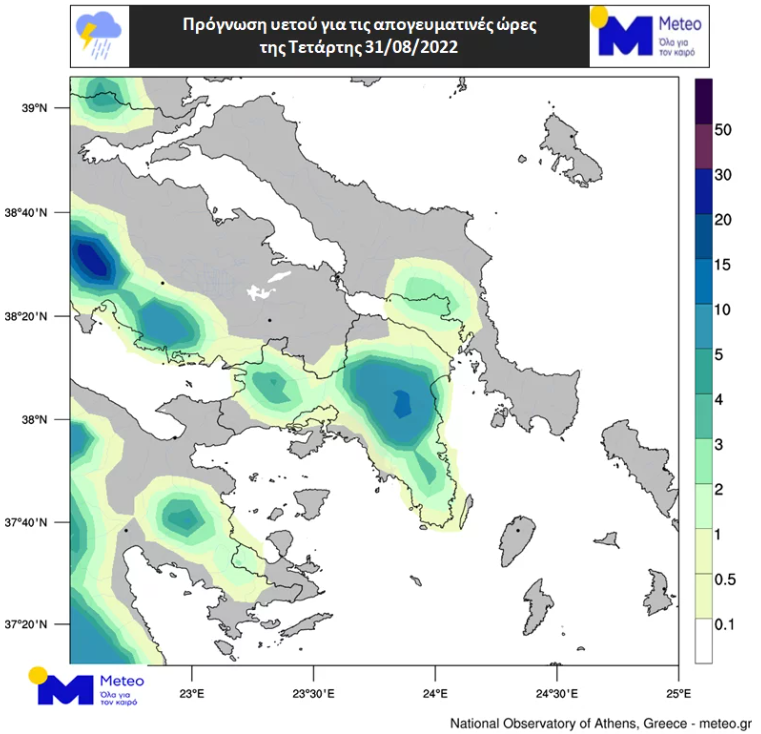 Σύμφωνα με τα διαθέσιμα προγνωστικά δεδομένα τα φαινόμενα θα εκδηλωθούν κυρίως τις μεσημεριανές και απογευματινές ώρες και στα ορεινά τμήματα του νομού ενδέχεται να είναι κατά τόπους ισχυρά. Στον Χάρτη 2 παρουσιάζεται ενδεικτικά ο υετός που αναμένεται τις απογευματινές ώρες της Τετάρτης στην Αττική αλλά και την Ανατολική Στερεά και Πελοπόννησο.