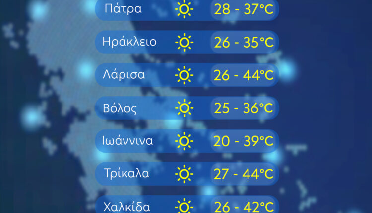Θερμοκρασία: Από 24 έως 41 και κατά τόπους στην κεντρική Μακεδονία 42 με 43 βαθμούς Κελσίου.