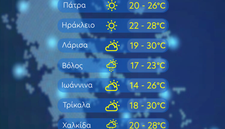 Η θερμοκρασία θα κυμανθεί από 14 έως 26 βαθμούς στη Βόρεια Ελλάδα (στη Δυτική Μακεδονία από 10 έως 24 βαθμούς), 19 έως 28 βαθμούς στην Κεντρική και Νότια Ελλάδα, 17 έως 30 βαθμούς στη Δυτική Ελλάδα (στην Ήπειρο από 12 έως 26 βαθμούς Κελσίου), 20 έως 28 βαθμούς στις Κυκλάδες και στην Κρήτη, 18 έως 29 βαθμούς στα νησιά του Ανατολικού Αιγαίου και έως τους 31 βαθμούς στα Δωδεκάνησα.
