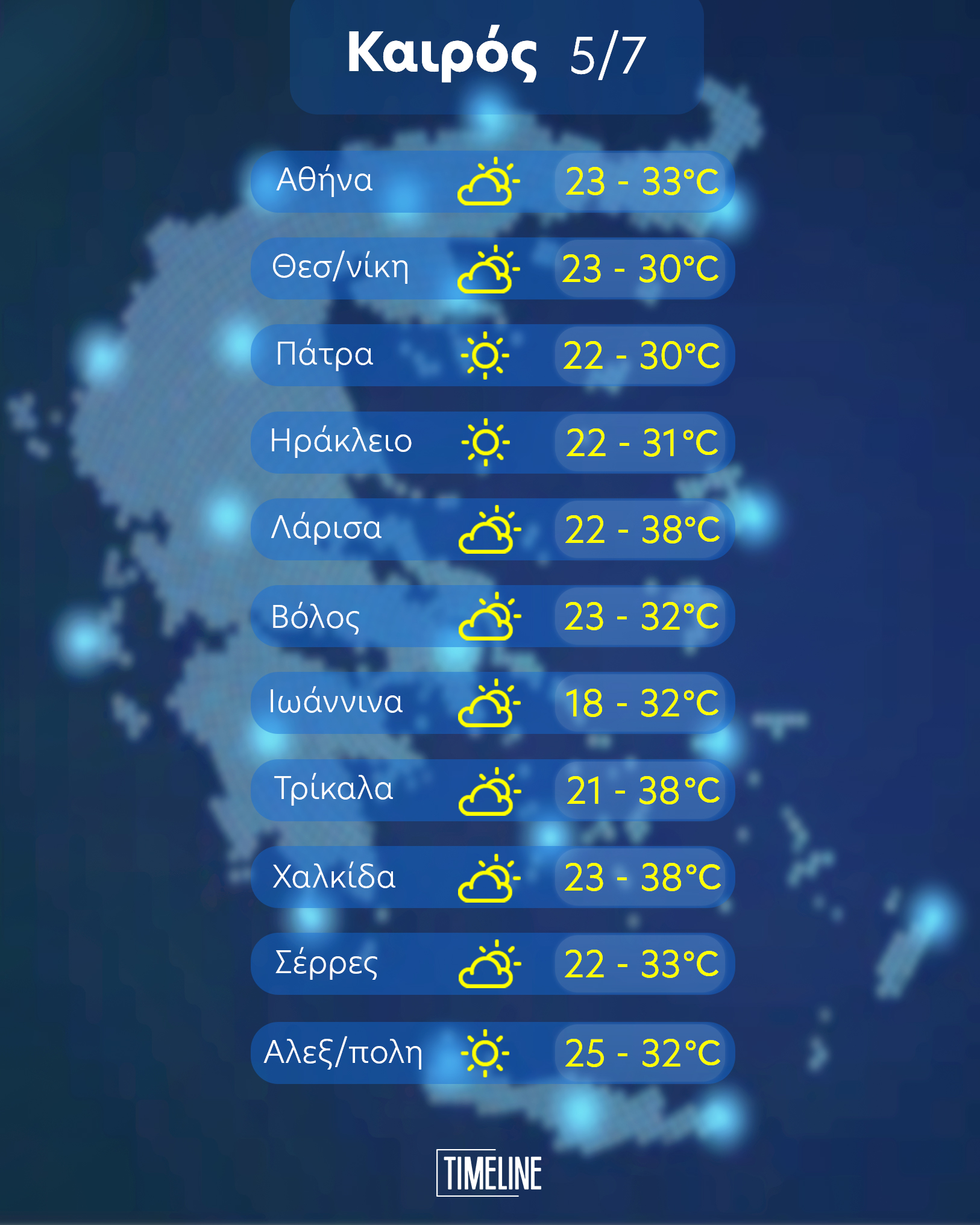 Θερμοκρασία: Από 20 έως 36 βαθμούς Κελσίου. Στην Ήπειρο η ελάχιστη 3 με 5 βαθμούς χαμηλότερη.