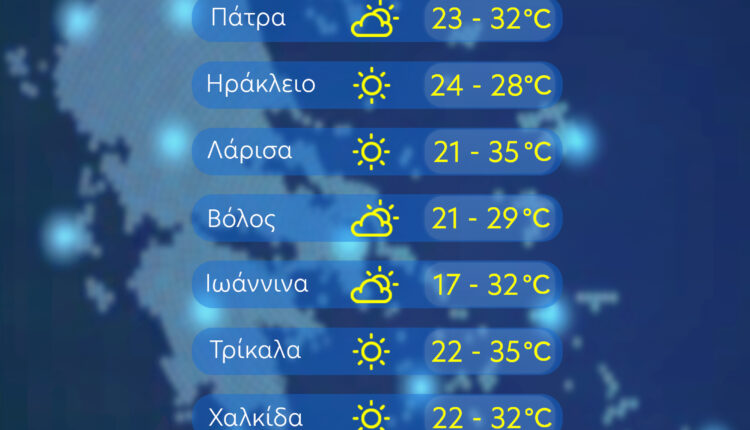 Θερμοκρασία: Από 21 έως 34 και τοπικά στη Θεσσαλία έως 35 βαθμούς Κελσίου.