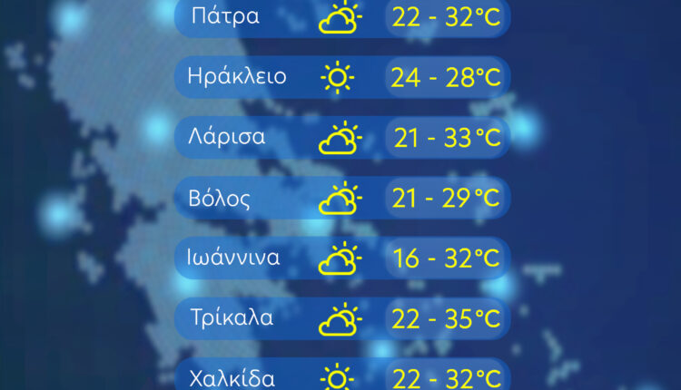 Θερμοκρασία: Από 20 έως 33 βαθμούς και στη δυτική Μακεδονία από 15 έως 30 βαθμούς Κελσίου.