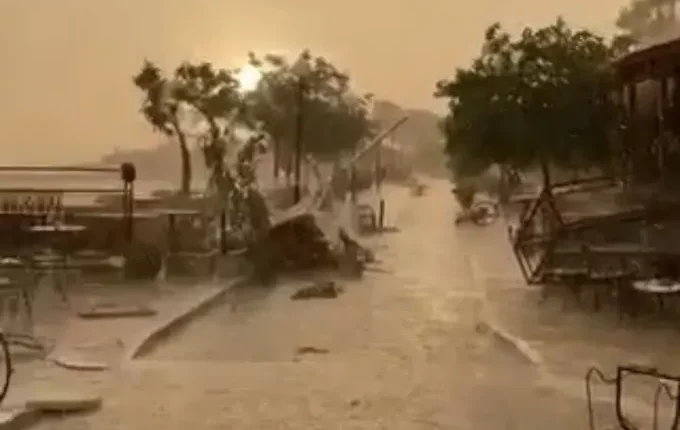 Οι υπάλληλοι προσπάθησαν απεγνωσμένα να σώσουν οτιδήποτε, αλλά το μπουρίνι τελικά ήταν αρκετά δυνατό και «σήκωσε» ομπρέλες, καρέκλες και τραπέζια.
