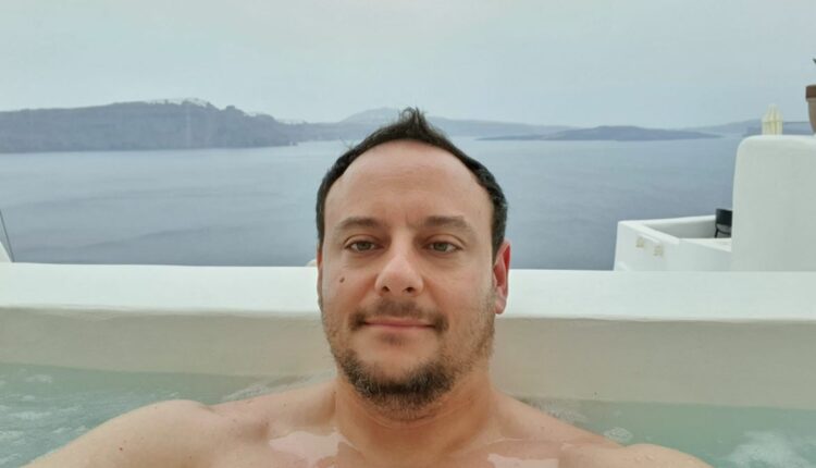 Ο καθηγητής ποζάρει στο φακό, μέσα στο τζακούζι ενώ πίσω του φαίνεται το απέραντο γαλάζιο και το αιγαιοπελαγίτικο τοπίο.