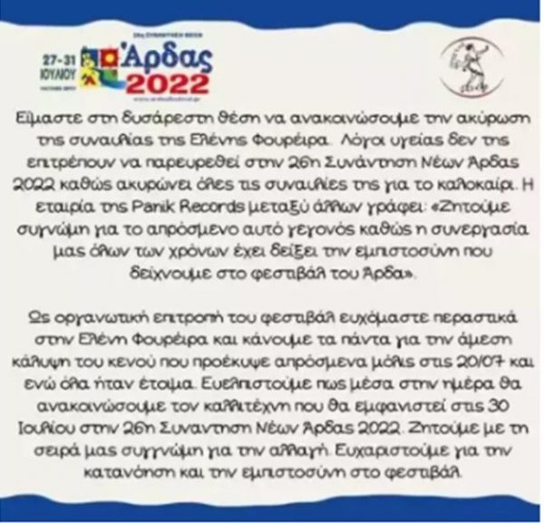 «Είμαστε στη δυσάρεστη θέση να ανακοινώσουμε την  ακύρωση της συναυλίας της Ελένης Φουρέιρα. Λόγοι υγείας δεν της επιτρέπουν να παρευρεθεί στην 26η Συνάντηση Νέων Άρδας 2022 καθώς ακυρώνει όλες τις συναυλίες της για το καλοκαίρι», έγραφε μεταξύ άλλων η ανακοίνωση.