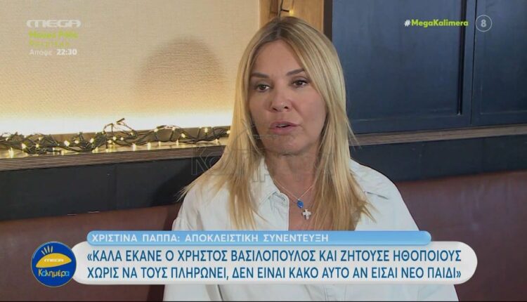 Μιλώντας στην εκπομπή «Mega Καλημέρα», η Χριστίνα Παππά δήλωσε: «Καλά κάνει ο Χρήστος Βασιλόπουλος και ζητούσε ηθοποιούς χωρίς να τους πληρώσει. Δεν είναι κακό αυτό, αν είσαι νέο παιδί και το κάνεις για την εμπειρία. Εμένα αν μου έλεγαν να κάνω κάτι αφιλοκερδώς, θα το έκανα».