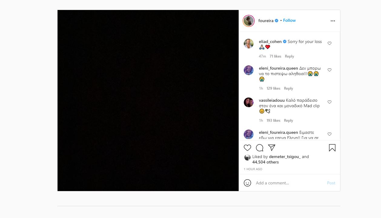 Συντετριμμένη από το χαμό του φίλου της η Ελένη Φουρέιρα πριν από λίγη ώρα έριξε «μαύρο» στο λογαριασμό της στο Instagram προς ένδειξη πένθους.