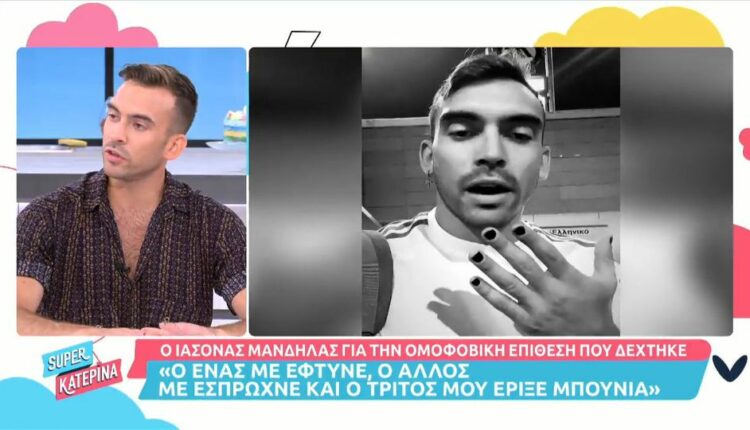 «Ήταν λίγο σοκαριστικό. Όλα έγιναν, επειδή είχα βάψει τα νύχια μου μαύρα. Ήταν 9 το βράδυ και μόλις είχα τελειώσει την πρόβα μου για το Pride, όπου και θα εμφανιστώ. Ήμουν στο μετρό του Περιστερίου και είπα να πάρω κάτι να φάω. Κάθομαι λοιπόν και παίζω με το κινητό μου και με πλησιάζουν τρία 14χρονα, το πολύ 1.69 και 50 κιλά, κρατώντας τσιγάρο. Με ρωτάει τότε, ο ένας γιατί έχω βαμμένα νύχια. Εγώ του απαντάω: “Γιατί έτσι μου αρέσει. Πειράζει κανέναν;”», περιέγραψε ο Ιάσονας Μανδηλάς.