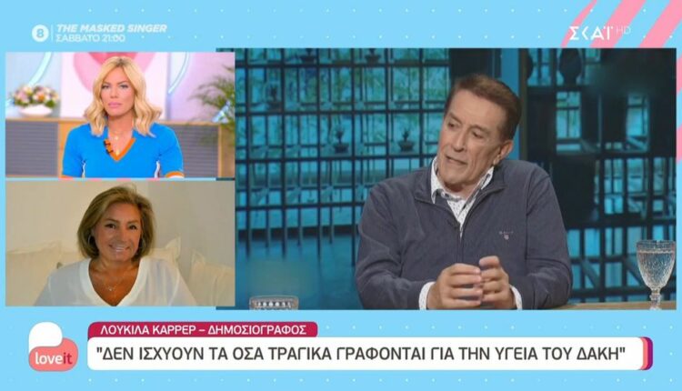 «Όταν ένας άνθρωπος είναι για σένα φίλος ζωής, έχεις μια σχέση ζωής, είναι το καθημερινό σου τηλεφώνημα για πάνω από τριάντα χρόνια, δεν μπορείς να βγεις να πεις τόσο προσωπικά δεδομένα. Αν ήθελα, τα τελευταία 4μισι χρόνια που δίνει μια μάχη και αυτό το λέω γιατί ο ίδιος το ομολόγησε, θα έβγαινα κάθε μέρα και θα μιλούσα για αυτό. Για όνομα του Θεού! Αυτό που θα πω είναι ότι οι πραγματικοί φίλοι και ευτυχώς έχει τέτοιους ανθρώπους που είναι ουσιαστικά δίπλα του, όχι περιγράφοντας τι βλέπουν μέσα από μια κλειδαρότρυπα, αλλά έχει δώσει ο ίδιος το κλειδί της ψυχής του, του σπιτιού και της καρδιάς του και μας έχει τιμήσει με την φιλία του δεν χρειάζεται να περιγράψουμε τι συμβαίνει μέσα στο δωμάτιο. Αυτοί που τον αγαπούν σιωπούν, σέβονται, προσεύχονται και βοηθούν ουσιαστικά. Δεν ισχύουν τα όσα τραγικά γράφονται για την υγεία του Δάκη. Παίρνει ο ίδιος τηλέφωνο αυτούς που θέλει. Βεβαίως δίνει μια μάχη, αλλιώς θα τον έβλεπες σε συναυλίες. Δίνει αυτή τη μάχη με αξιοπρέπεια. Τον ξέρω χρόνια τον Τάκη, δεν γνωρίζω πόσο φίλος είναι με τον Δάκη. Δεν σχολιάζω τη συγκεκριμένη δήλωση, αλλά όλα τα δημοσιεύματα που είδα στο διαδίκτυο. Δεν ισχύει τίποτα» τόνισε η δημοσιογράφος Λουκίλα Καρρέρ στο «Love It».