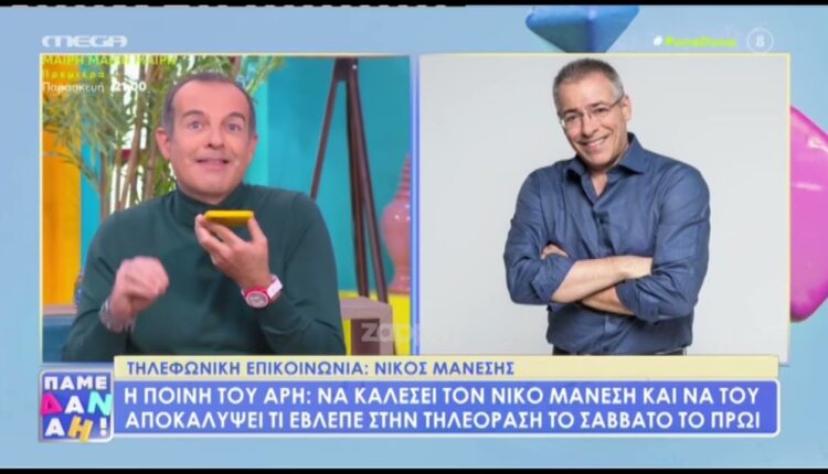 Ο Νίκος Μάνεσης και ο Άρης Καβατζίκης βρέθηκαν σε ένα τηλεοπτικό τετ α τετ, στον αέρα του Πάμε Δανάη, το οποίο είχε απρόσμενη εξέλιξη. Όλα ξεκίνησαν από το γεγονός ότι ο Άρης είχε τη χαμηλότερη βαθμολογία στις αποστολές της ομάδας. Η ποινή που έπρεπε να του επιβληθεί, λοιπόν, ήταν η εξής: Να καλέσει τον Νίκο Μάνεση και να του αποκαλύψει τι έβλεπε στην τηλεόραση το πρωί του περασμένου Σαββάτου.