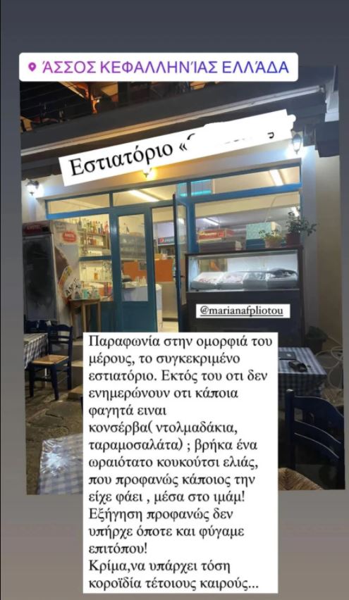 Οι δύο φίλες επισκέφθηκαν ταβέρνα στο νησί και εκεί, όπως καταγγέλει στον προσωπικό της λογαριασμό στο Instagram η Ζέτα Δούκα, βρήκε ένα κουκούτσι ελιάς στο ιμάμ της που μαρτυρά ότι ήταν αποφάγια προηγούμενου πελάτη. Επιπλέον, δεν ενημερώνει το κατάστημα ποιες τροφές είναι από κονσέρβα.