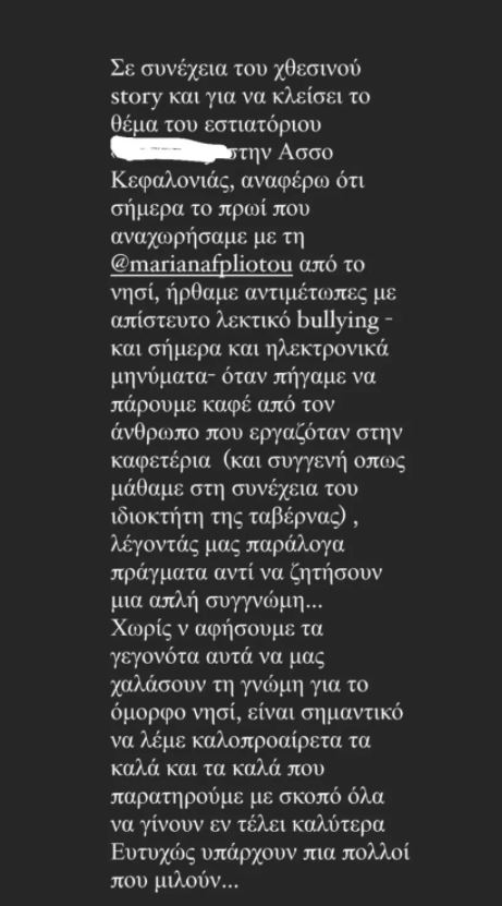 Μάλιστα, σε συνέχεια του περιστατικού, η Ζέτα Δούκα υποστηρίζει ότι την επόμενη μέρα σε καφετέρια του νησιού – που όπως αποδείχθηκε άνηκε σε συγγενή του ιδιοκτήτη της ταβέρνας- δέχθηκαν λεκτική επίθεση.