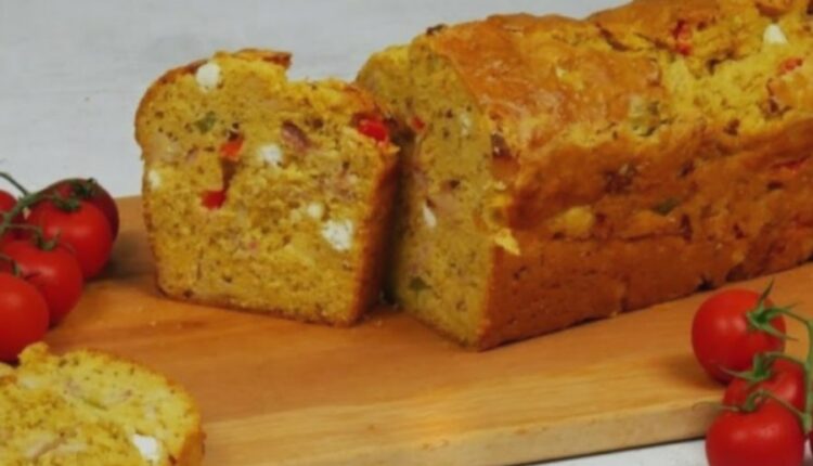 Ανακατεύουμε καλά και αδειάζουμε το μείγμα του κέικ με πιπεριές σε μια φόρμα αλευρωμένη και αλειμμένη με Bιτάμ, κουνώντας την, ώστε το μείγμα να απλωθεί ομοιόμορφα.