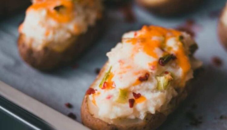 Πλένετε πολύ καλά τις πατάτες και τις στεγνώνετε σε απορροφητικό χαρτί. Χαράζετε στην κάθε πατάτα ένα καπάκι σε σχήμα έλλειψης και αλείφετε τη φλούδα εξωτερικά με λίγο βούτυρο. Τυλίγετε κάθε πατάτα με αλουμινόχαρτο και τις ψήνετε για 1 ώρα στους 180° C – 200° C, μέχρι να μαλακώσουν. Τις βγάζετε από το φούρνο και, μόλις κρυώσουν λίγο, αφαιρείτε το καπάκι και αδειάζετε αρκετή από τη σάρκα τους.