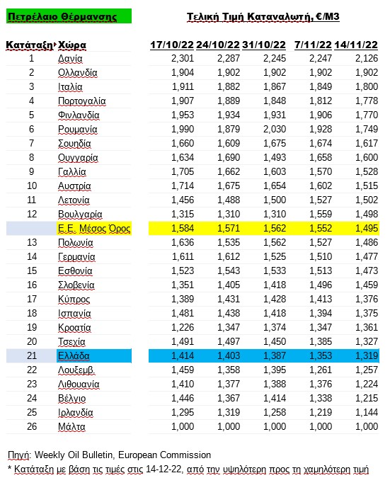 Όπως προκύπτει από το «Weekly Oil Bulletin», πιο φθηνές χώρες αναφορικά με την τιμή διάθεσης του πετρελαίου θέρμανσης είναι κατά σειρά, η Μάλτα, η Ιρλανδία, το Βέλγιο, η Λιθουανία, το Λουξεμβούργο, η Ελλάδα και η Τσεχία. Ως ακριβότερες εμφανίζονται, Δανία, Ολλανδία, Ιταλία, Πορτογαλία, Φινλανδία, Ρουμανία και Σουηδία.