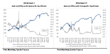 Η πορεία του αντίστοιχου δείκτη ελληνικών εταιρικών ομολόγων της Τράπεζας Πειραιώς (βλ. Διάγραμμα 2) έχει καταγράψει πτώση κατά 5, γεγονός που μεταφράζεται σε άνοδο της απόδοσής του στο 3,69% από 2,63% στις αρχές του έτους.