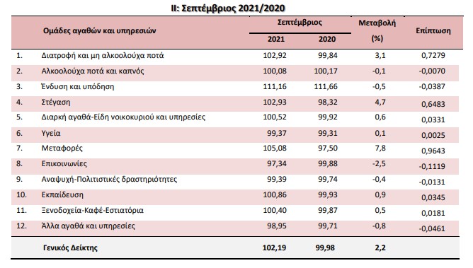 • 2,0% στην ομάδα Αλκοολούχα ποτά και καπνός, λόγω αύξησης κυρίως των τιμών στα αλκοολούχα ποτά (μη σερβιριζόμενα).
