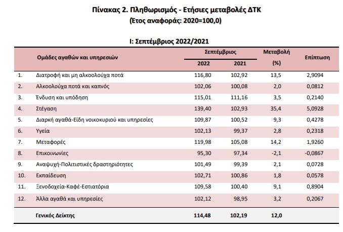 Η αύξηση του Γενικού ΔΤΚ κατά 12,0% τον μήνα Σεπτέμβριο 2022, σε σύγκριση με τον αντίστοιχο Δείκτη του Σεπτεμβρίου 2021, προήλθε κυρίως από τις μεταβολές στις ακόλουθες ομάδες αγαθών και υπηρεσιών: