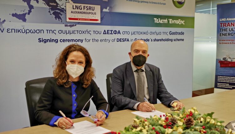 Επικυρώθηκε και επίσημα η συμμετοχή του Διαχειριστή Εθνικού Συστήματος Φυσικού Αερίου (ΔΕΣΦΑ Α.Ε.) στο μετοχικό σχήμα της Gastrade Α.Ε, της εταιρείας που αναπτύσσει την Πλωτή Μονάδα Αποθήκευσης και Επαναεριοποίησης (FSRU) υγροποιημένου φυσικού αερίου (LNG) στην Αλεξανδρούπολη, με την απόκτηση του 20% του μετοχικού της κεφαλαίου από πλευράς του Διαχειριστή. Η συμφωνία για τη μεταβίβαση των μετοχών υπεγράφη από την Ανώτατη Εκτελεστική Διευθύντρια του ΔΕΣΦΑ, κ. Maria Rita Galli και την Ιδρύτρια Μέτοχο και Πρόεδρο του Διοικητικού Συμβουλίου της Gastrade, κ. Ελμίνα Κοπελούζου, σήμερα, στα γραφεία της Gastrade στην Αθήνα.