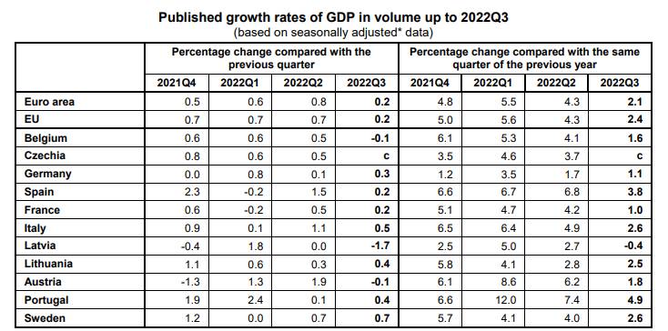 Σύμφωνα πάντα με τη Eurostat, ο ρυθμός ανάπτυξης το γ’ τρίμηνο του 2022 τόσο για την ΕΕ εν συνόλω όσο και για την Ευρωζώνη εκτιμάται ότι αυξήθηκε 0,2% σε σύγκριση με το προηγούμενο τρίμηνο.