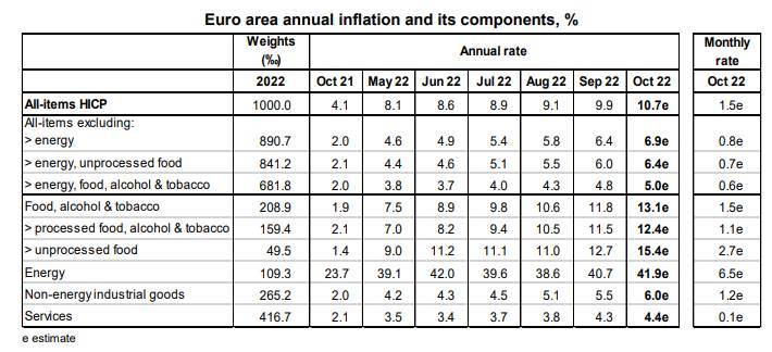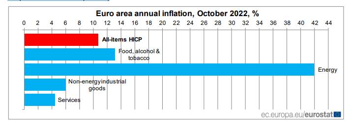 Αναφορικά με τον πληθωρισμό, η ενέργεια, όπως αναμενόταν, είναι αυτή που σημειώνει τη μεγαλύτερη ετήσια άνοδο στο 41,9% σε σύγκριση με το 40,7% τον Σεπτέμβριο, ακολουθούν τα τρόφιμα, ποτά και καπνικά προϊόντα με αύξηση 13,1% έναντι 11,8% του Σεπτεμβρίου. Τα βιομηχανικά μη ενεργειακά αγαθά σημειώνουν αύξηση 6% έναντι 5,5% τον προηγούμενο μήνα και οι υπηρεσίες 4,4% έναντι 4,3% τον Σεπτέμβριο.